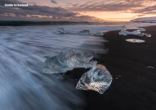 杰古沙龙冰河湖旁的钻石冰沙滩上也陈列着被冲回岸上的冰块;阳光下,冰块熠熠发光,似钻石般晶莹、闪亮。