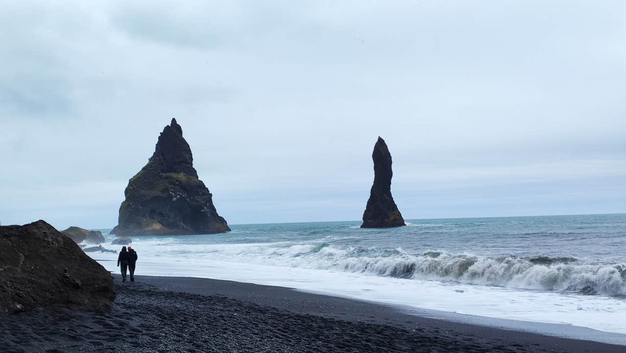 异形的玄武岩悬崖和石柱点缀其间,为黑沙滩增添了如外星世界般的神秘气息。