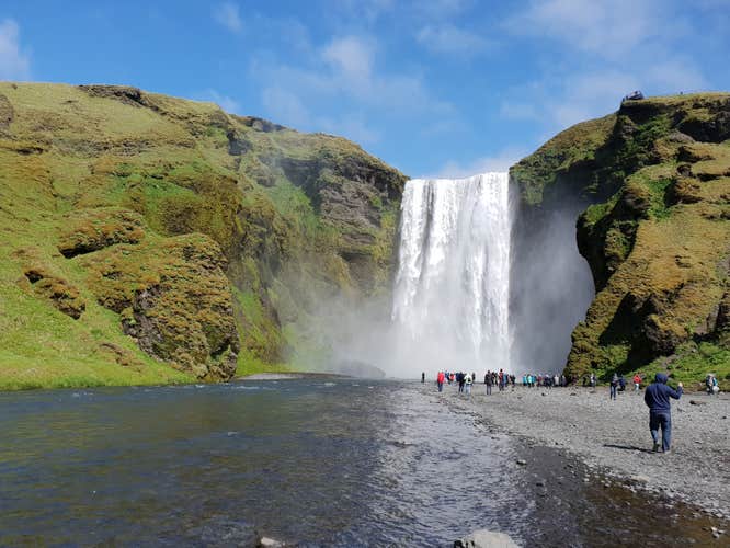 三大瀑布中最后一站是巍峨的斯科加瀑布(Skogafoss),水流从约60米高处一泻而下,气势磅礴。晴天时水雾中经常会出现彩虹,与黄金瀑布相映成趣。