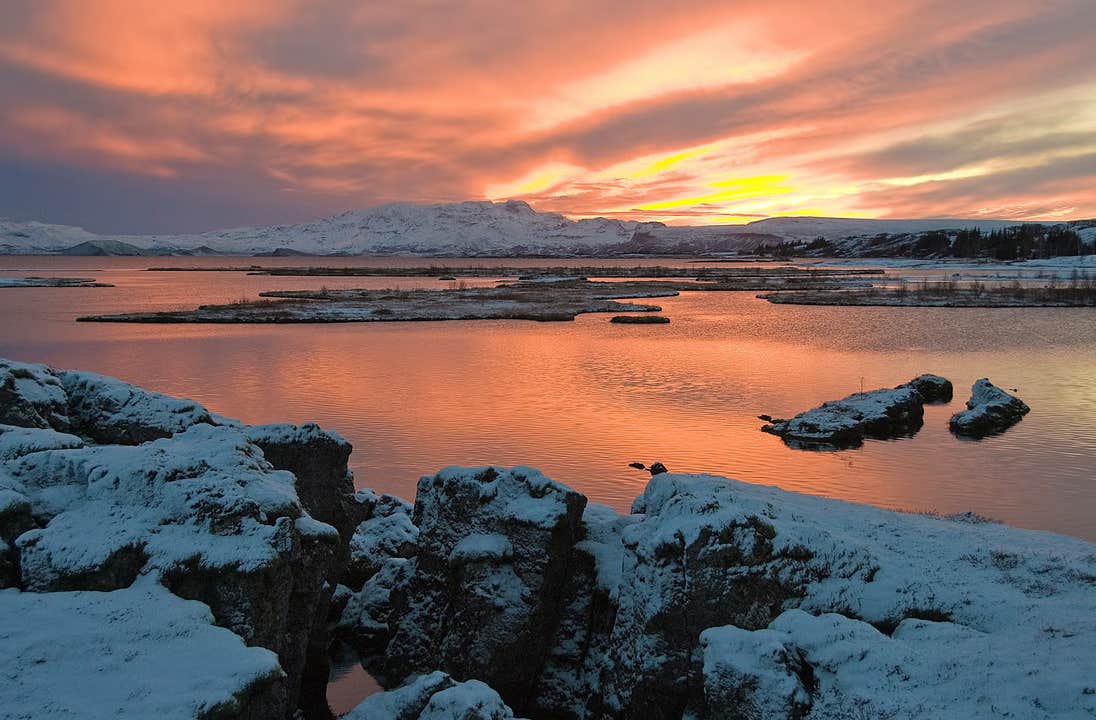 第一站是辛格维利尔国家公园。辛格维利尔国家公园堪称自然与人文结合的典范——变幻万千的火山地貌区和历史遗迹相得益彰。附近景色优美,冰岛最大的天然湖泊辛格瓦德拉湖(Þingvallavatn)便坐落于此,山谷在大西洋中脊和辛格瓦德拉湖(Þingvallavatn)湖岸之间延伸。也正是这宁静美丽的所在,见证了1000多年前世界上第一个议会的建立。