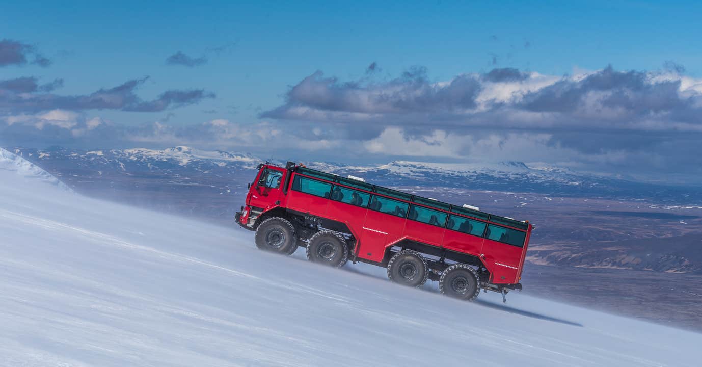 从停车场出发,您将乘坐舒适的接驳巴士前往朗格冰川脚下的Geldingafell基地。途中,您可以透过车窗欣赏冰岛高地的绝美景致,同时聆听导游播放的冰岛音乐以及有趣的故事和介绍。