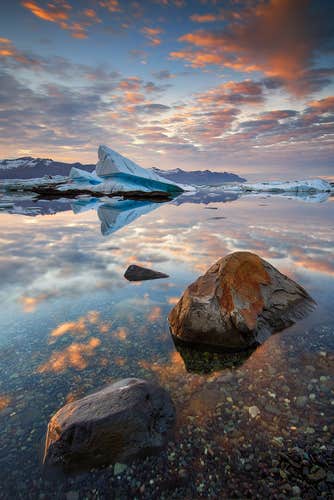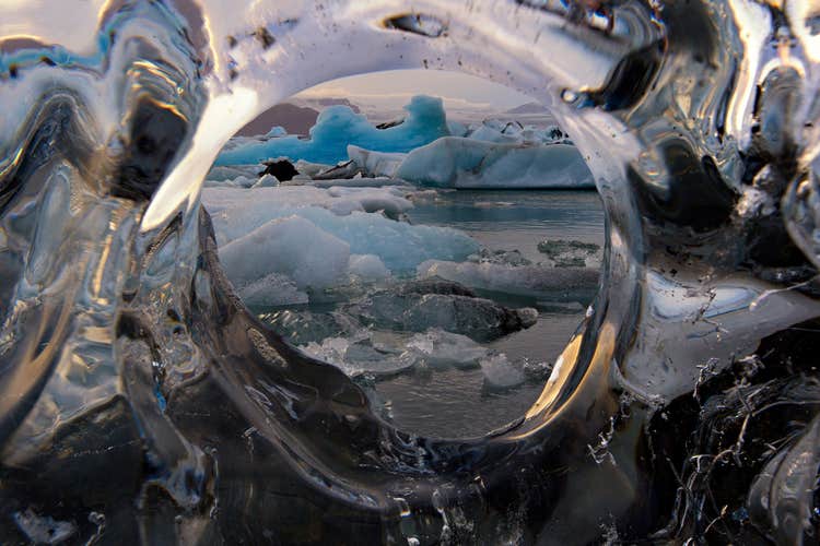 冰湖承接Breiðarmerkurjökull冰川的融水而成,是冰岛最深的湖泊之一,湖中布满了大大小小、颜色各异的冰块:一些冰块呈现纯白色彩,一些冰块内含有氧气,呈现出深邃的冰蓝。