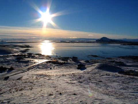 行程第一站是众神瀑布(Godafoss),该瀑布在冰岛历史上曾经扮演过重要角色,据说当年法律宣讲者索格尔·洛斯维特宁加戈迪(Thorgeir Ljosvetningagodi)将旧时北欧神像投入这道瀑布,以此宣布基督教为冰岛正教,从而平息了一场宗教冲突,而该瀑布也因此得名。离开众神瀑布后,继续前往米湖。