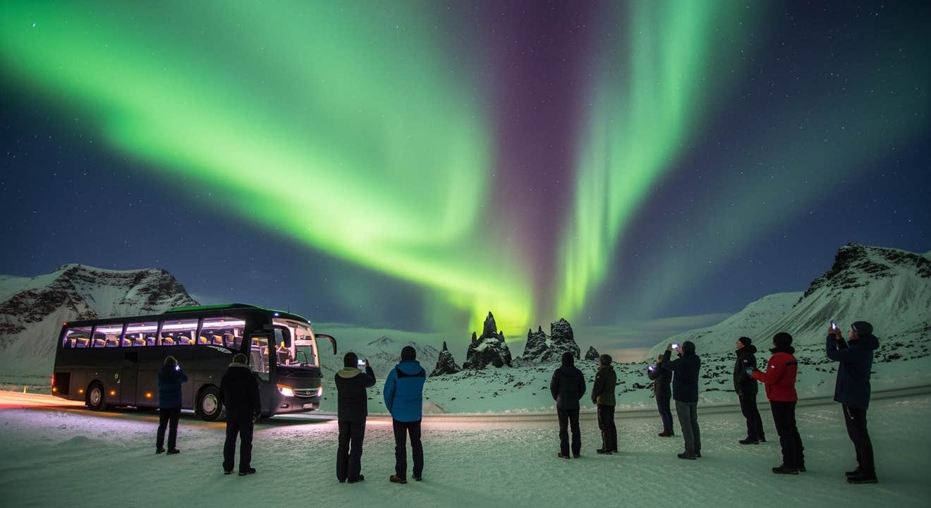 你将在选定的接送点被接走,离开雷克雅未克,踏上观赏极光的旅程。在冬季,来自世界各地的游客纷纷来到冰岛,希望看到这些闪烁的彩色光带装饰夜空。