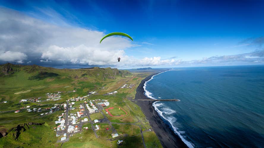 乘坐滑翔伞,从全新角度欣赏冰岛南岸的壮丽景色!这场惊险刺激的滑翔伞体验将带你翱翔天空,从鸟瞰视角欣赏雷尼斯黑沙滩、瀑布、维克小镇等冰岛南岸的经典美景。