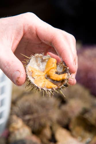 游览途中,我们会撒网打捞海鲜,你将可以品尝到从海里刚刚打捞出来的扇贝、海胆、鱼子等。我们已经准备好了酱油、芥末、姜片,让你赏着海景吃寿司生鱼片!