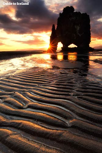接下来的景点闻名遐迩,可堪称为冰岛最有名的石头——Hvítserkur。水中竖立起的三道石柱,仿佛三条“腿”,其景象很像一只喝水的大象。但根据民间传说,这块岩石曾是一个想用巨石捣毁修道院的三条腿巨人;不过它停留的时间有些太长了,天亮时阳光照射,巨人就石化成了现在的这块Hvítserkur石。Hvítserkur还是一处观鸟胜地。虽然岩石仅仅高出海面15米,但有许多鸟类栖息在岩石的隐蔽角落里,尤其是在夏天的时候。